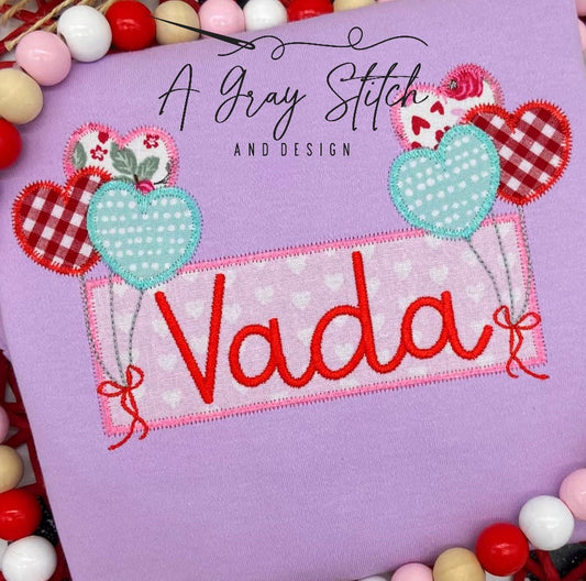 Zig Zag Applique Name Frame with Balloon Hearts Valentine's Machine Embroidery Design