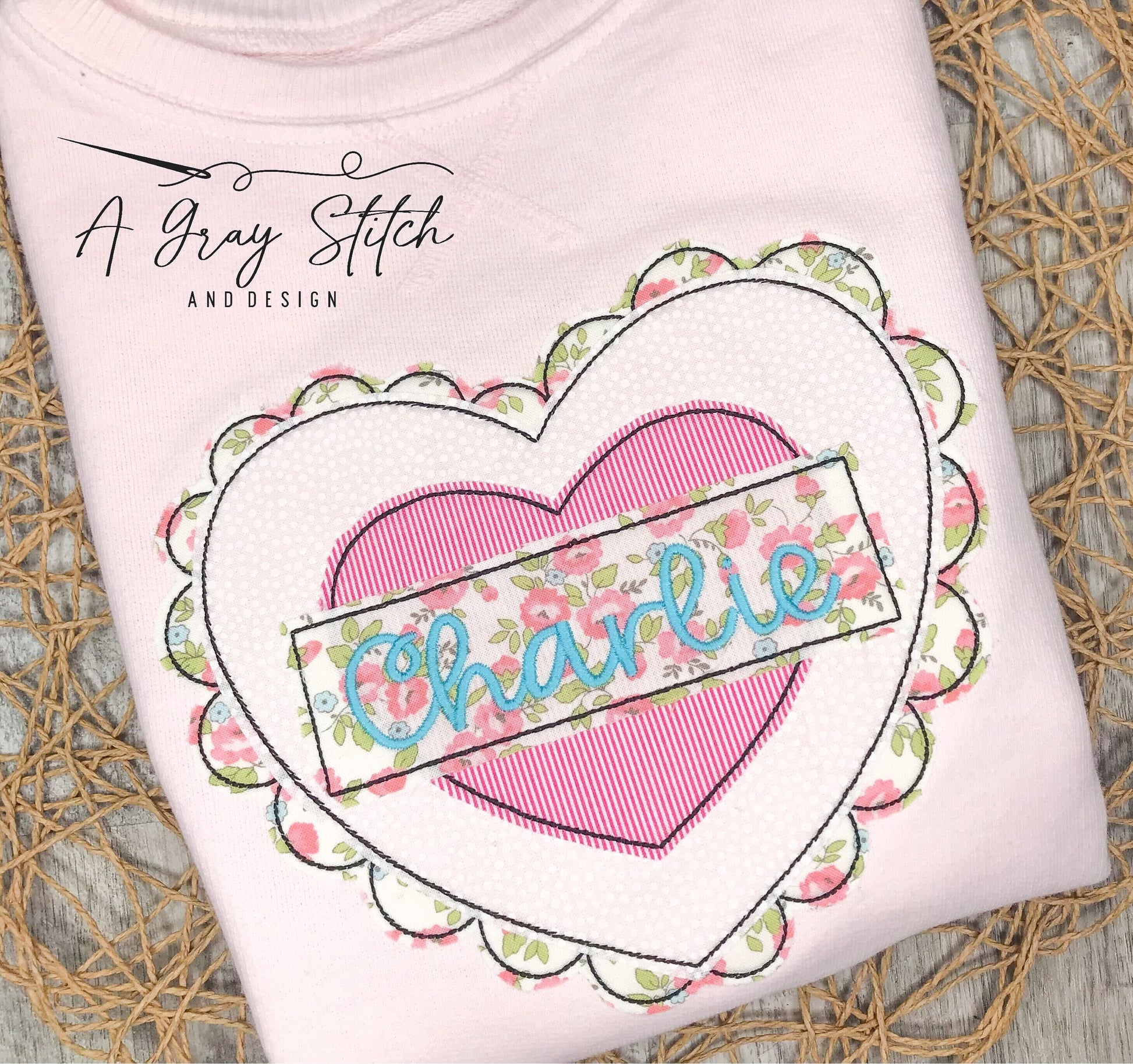 Scallop Trimmed Heart Bean Stitch Applique Machine Embroidery Design Quick Stitch