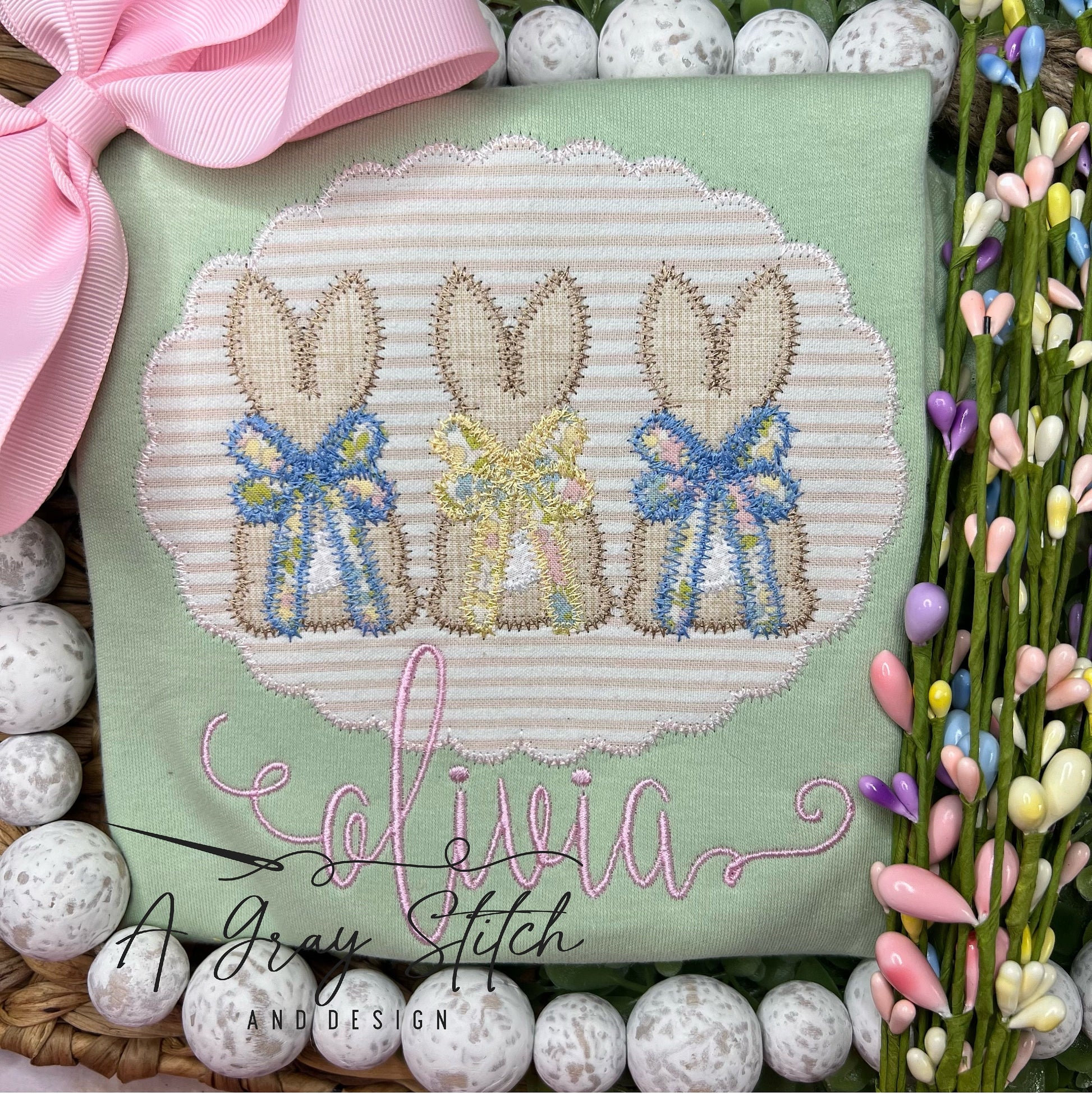 Zig Zag Scallop Applique Frame with Applique Bunny Trio with Bows Machine Embroidery Design